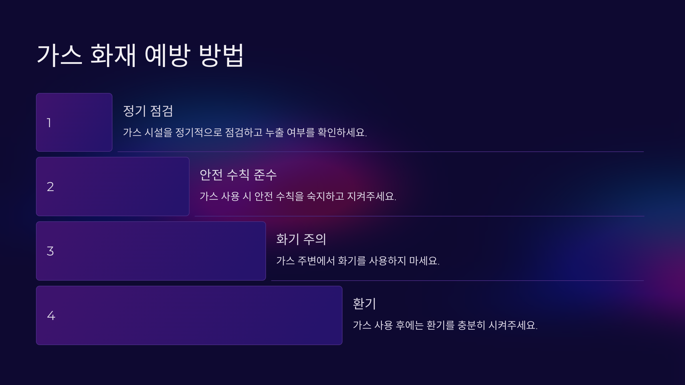 가스 화재를 예방하기 위해서는 평소에 안전 점검을 철저히 하고, 올바른 가스 사용 습관을 유지하는 것이 중요합니다. 예방은 화재가 발생하기 전 가장 확실한 대응법이기 때문에 작은 습관부터 실천해 나가는 것이 좋아요.