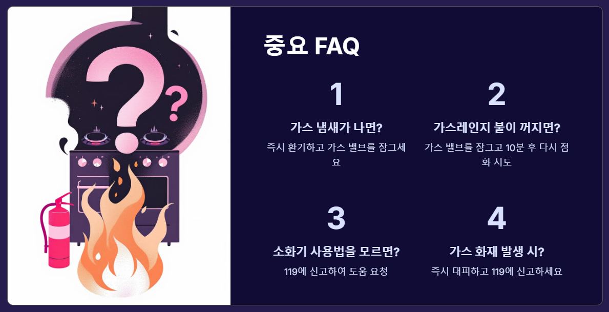 A1. 가스 냄새가 나면 즉시 창문을 열어 환기시키고 가스 밸브를 잠그세요. 절대 전기 스위치를 건드리지 말고, 안전한 장소로 대피 후 119에 신고하세요.