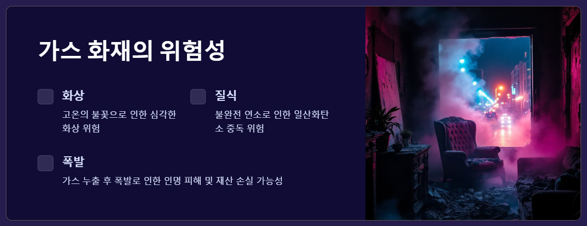 가스 화재는 단순 화재와는 달리 폭발성과 유독가스로 인해 매우 위험해요. 아래는 주요 위험성입니다.