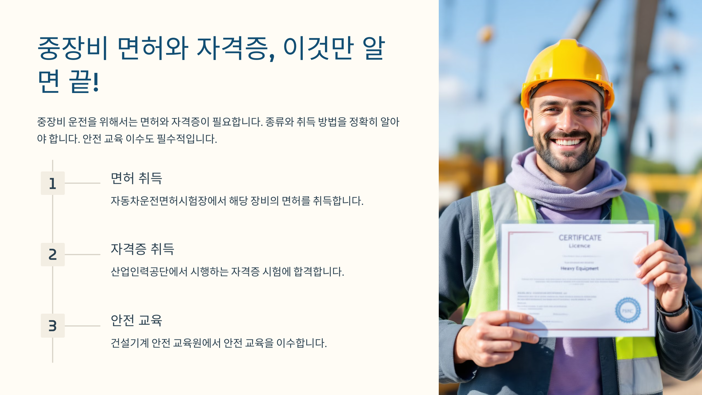 중장비를 운전하려면 반드시 면허나 자격증이 필요해요. 무면허로 운전하면 법적 처벌을 받을 수 있고, 사고 발생 시 책임도 커지기 때문에 꼭 취득해야 해요.
