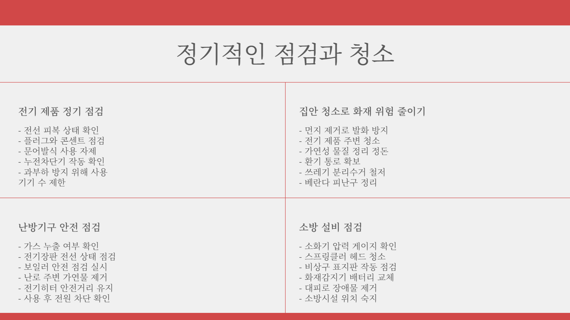 • 화재 경보기 점검: 화재 경보기의 배터리를 정기적으로 교체하고, 작동 여부를 확인합니다.