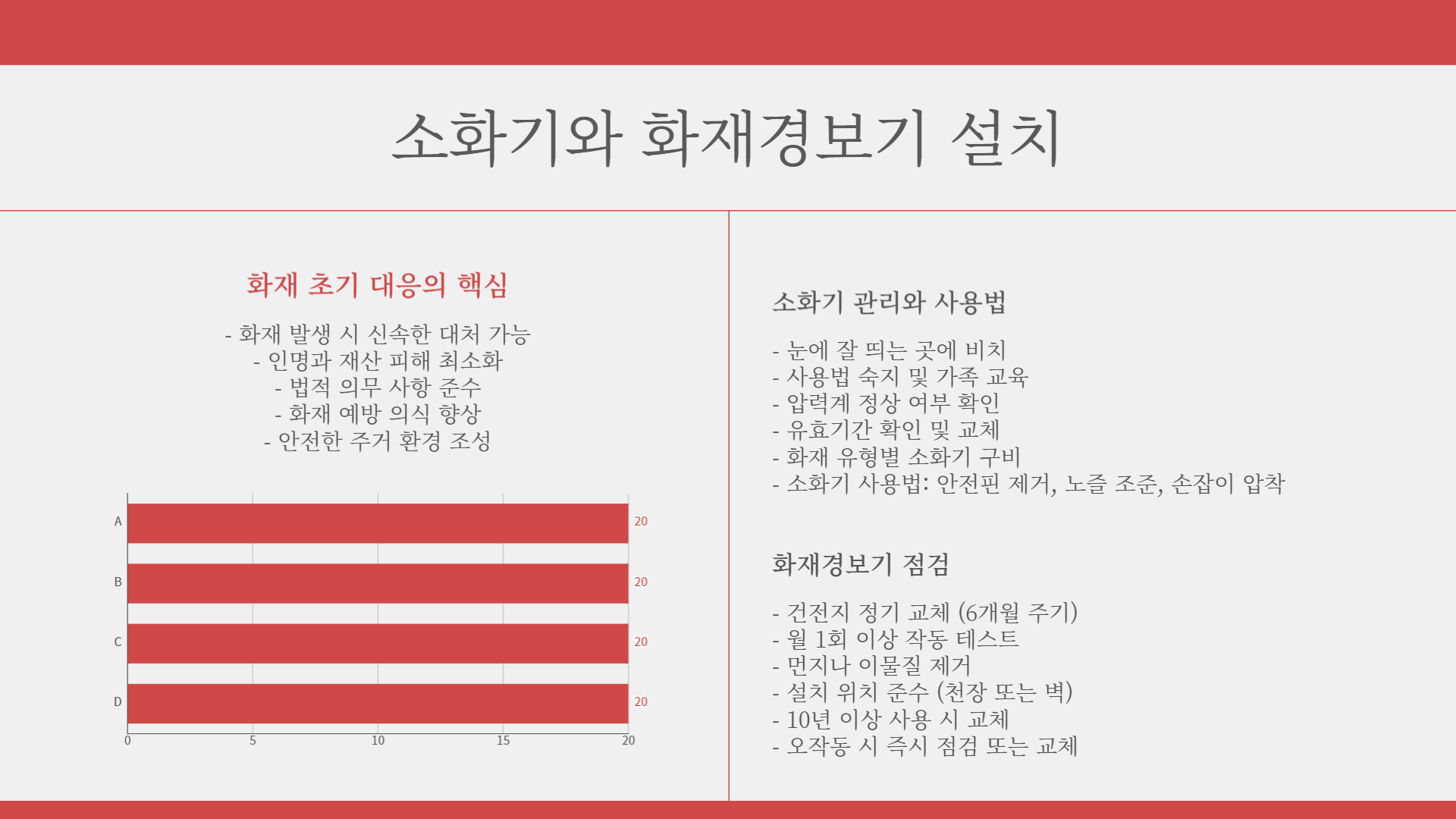 - 화재 경보기 점검: 화재 경보기의 배터리를 정기적으로 교체하고, 작동 여부를 확인합니다.