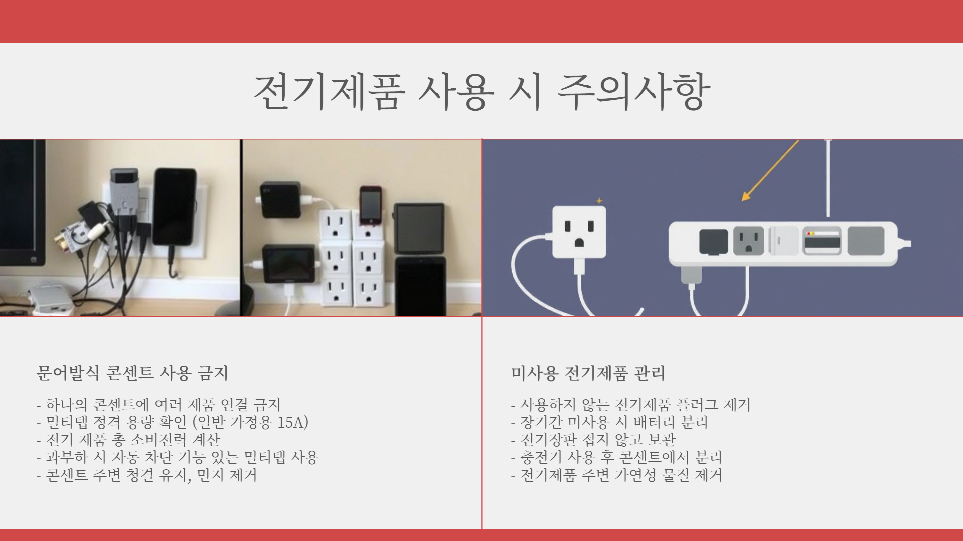 - 전기 제품 점검: 전기 제품의 상태를 정기적으로 점검하고, 고장 난 제품은 즉시 수리하거나 교체합니다.