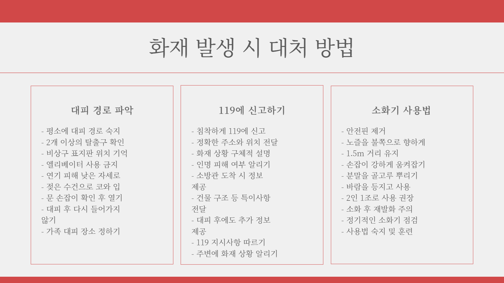 화재 발생 시 대피하는 방법을 미리 익혀 두는 것이 중요합니다.