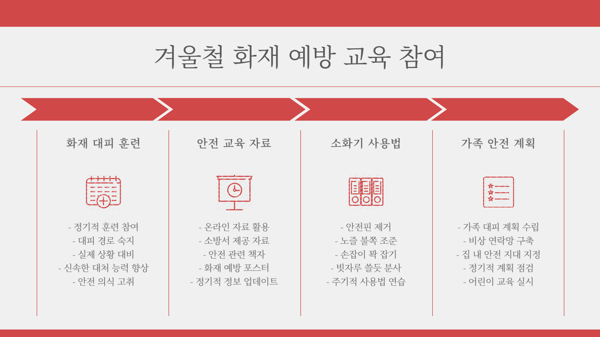 - 안전 교육 자료 활용하기: 다양한 안전 교육 자료를 활용하여 화재 예방에 대한 지식을 쌓습니다.