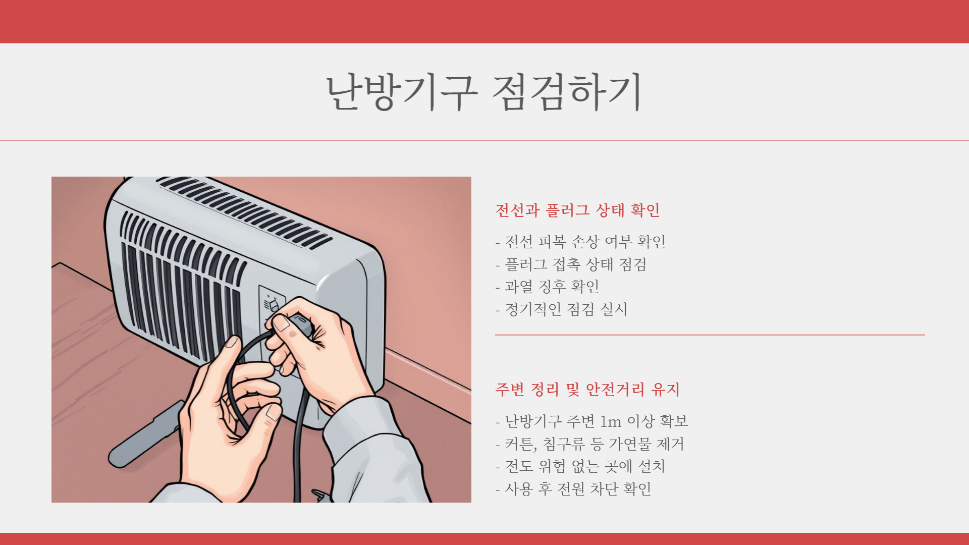 겨울철에는 난방 기구를 많이 사용하게 됩니다. 난방 기구를 사용하기 전에는 반드시 점검해야 합니다.