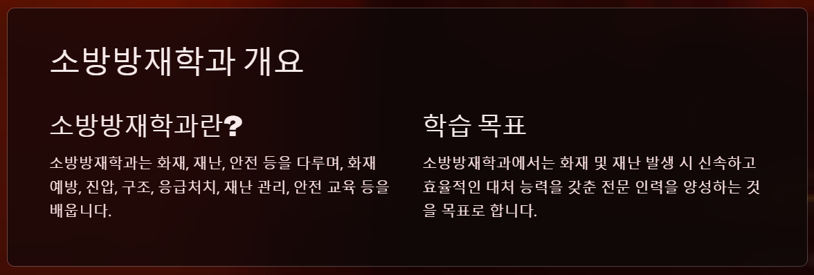 학생들은 화재 원인 분석, 화재 시뮬레이션, 소방설비 설계 및 관리, 재난 대응 훈련 등을 배우며 실무 중심의 교육을 받게 돼요. 졸업 후에는 공공기관과 민간기업에서 다양한 역할을 수행할 수 있어요.