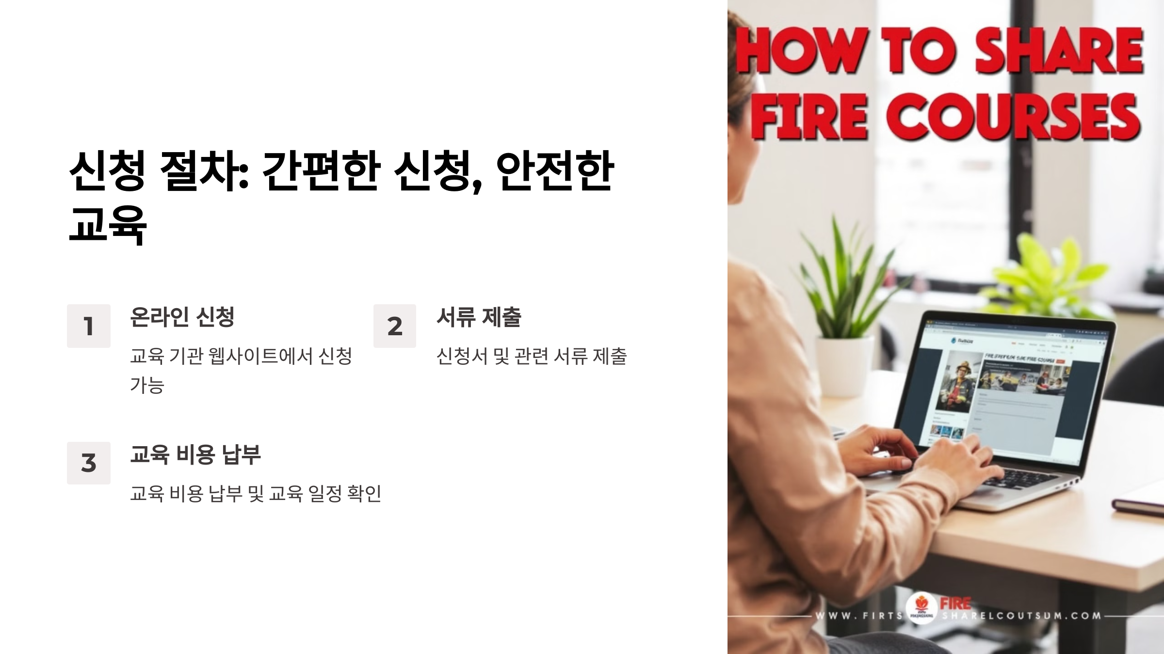 강습교육 신청은 한국소방안전원 등의 공식 홈페이지를 통해 온라인으로 진행됩니다. 신청 시 신분증 사본 등 필요한 서류를 제출해야 하며, 교육 일정과 장소는 해당 기관의 공지사항을 참고하시기 바랍니다. 간단한 절차로 진행되며, 아래 단계를 참고하세요.