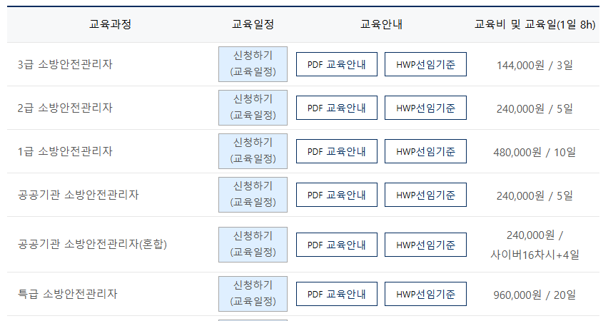 - 3급 소방안전관리자: 교육 시간은 24시간(3일)으로 유지되지만, 수수료는 14만 4천 원으로 인상되었습니다.