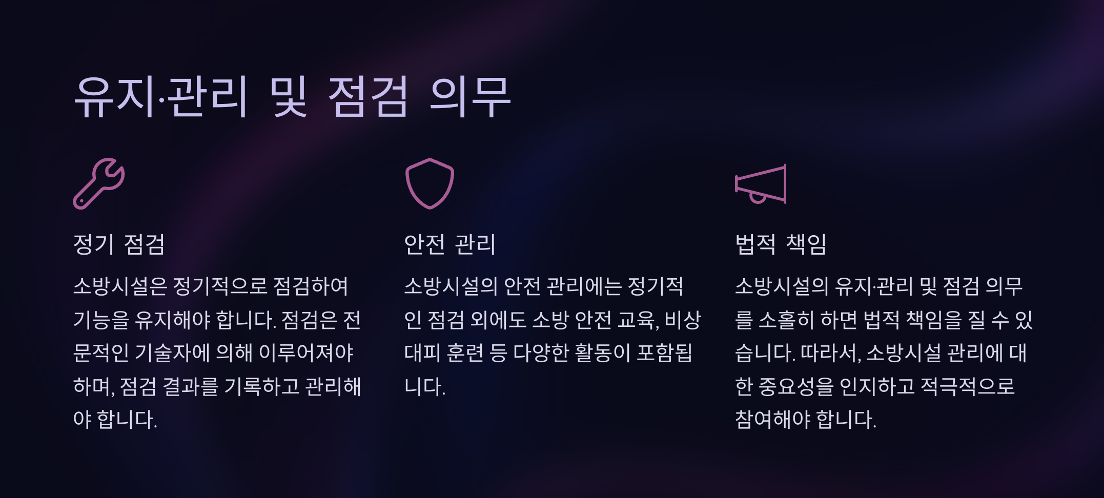 법률은 소방시설 설치 기준을 구체적으로 제시하고, 각 시설에 적합한 관리 방법과 주기적인 점검 의무를 규정해요. 이를 통해 안전을 강화하고 법적 책임을 명확히 하고 있어요.