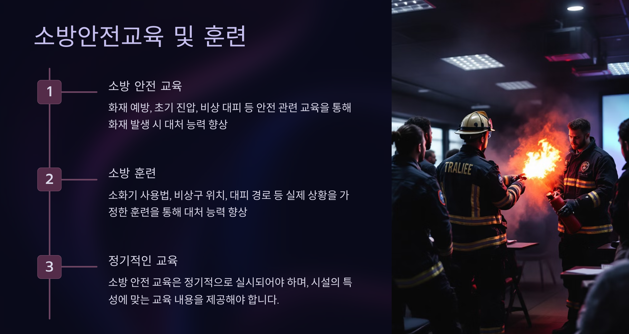 훈련 내용에는 소화기 사용법, 대피 경로 안내, 화재 시 행동 요령 등이 포함돼요. 교육은 직원과 이용자를 대상으로 이루어지며, 실전 대응 능력을 강화하기 위해 시뮬레이션 훈련도 포함될 수 있어요.