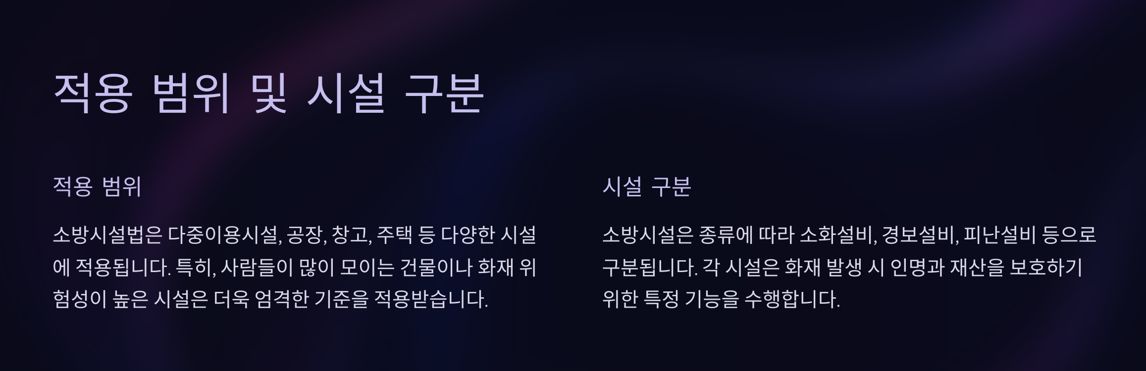 이 법의 적용 범위는 건축물, 공장, 다중이용시설, 위험물 저장소, 지하 시설물 등 다양한 공간을 포함해요. 규모와 용도에 따라 설치 및 관리 기준이 다르게 적용돼요.