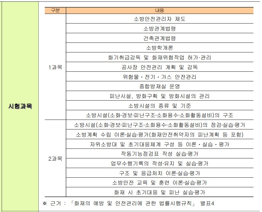 시험 과목은 법령 개정 등에 따라 변경될 수 있으므로, 최신 정보를 한국소방안전원 공식 홈페이지에서 확인하시기 바랍니다.