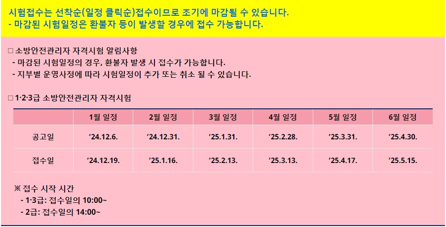 A2. 소방안전관리자 1급 시험은 매년 상반기와 하반기에 한 번씩 시행됩니다. 시험 접수는 보통 시험일 약 1~2달 전에 이루어지며, 시험 시행 후 약 2주 내에 결과가 발표됩니다. 자세한 일정은 한국소방안전원 공식 홈페이지에서 확인할 수 있어요.
