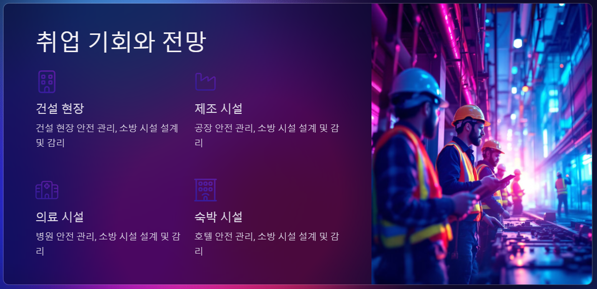 특히 대형 건물이나 공공 시설에서는 소방안전관리가 법적으로 의무화되어 있기 때문에 관련 자격증을 보유한 사람들은 안정된 직장을 구하기 쉬워요. 추가 교육과 경력을 쌓으면 더 높은 직급으로 승진하거나 소방설비 전문가로 활동할 수 있는 기회도 열려 있어요.