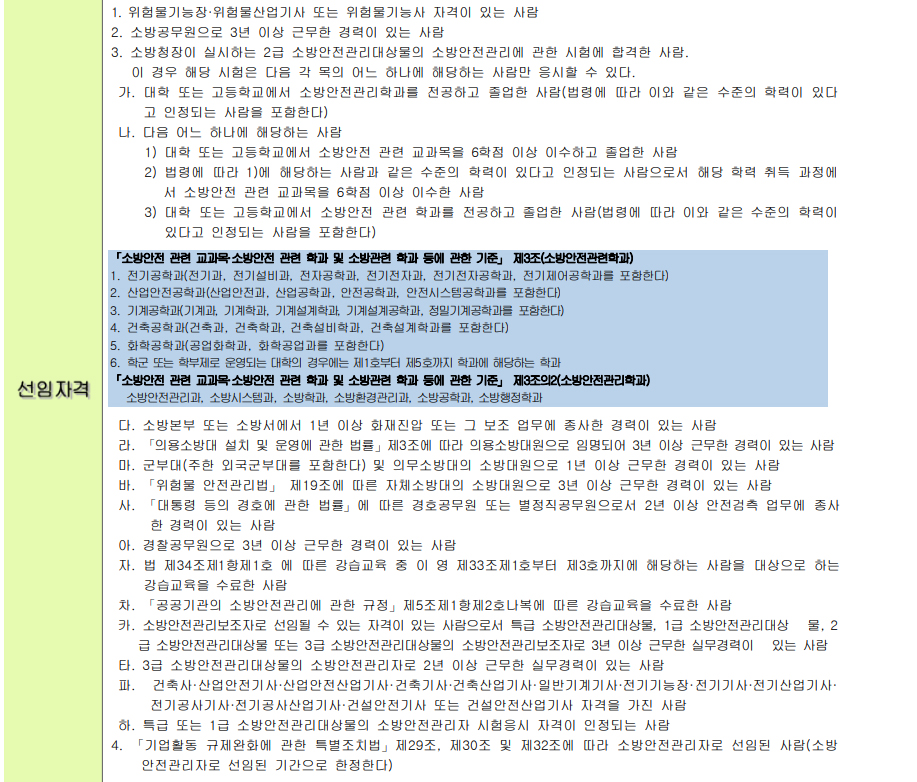 소방안전관리자 2급의 응시자격은 아래 선임자격에 해당되거나 한국소방안전원 강습교육을 5일(40시간)의 강습교육 수료시 자동으로 응시자격이 부여됩니다. 누구나 소방안전 관련 업무에 관심이 있다면 도전할 수 있는 개방적인 자격이에요.