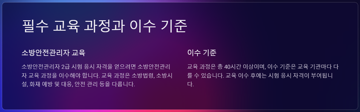교육 이수는 자격증 취득을 위한 필수 조건일 뿐만 아니라 실무 능력을 강화하는 데도 큰 도움이 돼요. 소방안전관리 업무에 필요한 지식을 쌓을 수 있어 직무 수행 시 더욱 자신감을 가질 수 있어요.