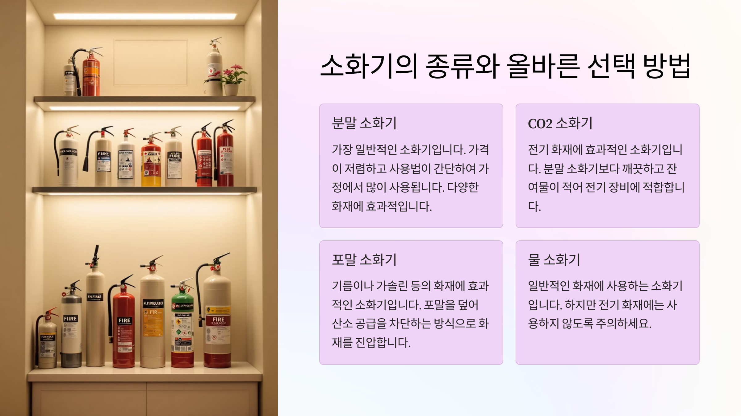 소화기는 화재의 종류에 따라 다양한 유형이 있어요. 올바른 소화기를 선택하고 사용하는 것이 중요한데, 잘못된 소화기를 사용하면 불을 끄는 데 실패하거나 오히려 화재를 악화시킬 수 있어요.