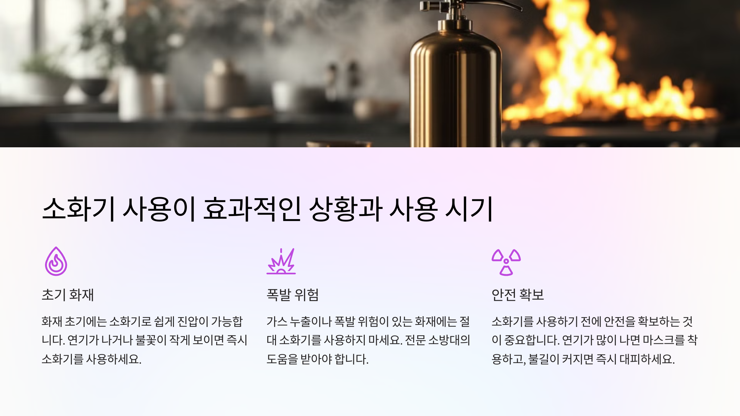 소화기는 화재 초기 대응에 가장 효과적인 도구 중 하나예요. 하지만 모든 상황에서 소화기를 사용하는 것이 적절한 것은 아니에요. 오히려 잘못된 상황에서 사용하면 위험을 키울 수 있어요. 그렇다면 소화기를 언제, 어떤 상황에서 사용하는 것이 가장 효과적일까요?