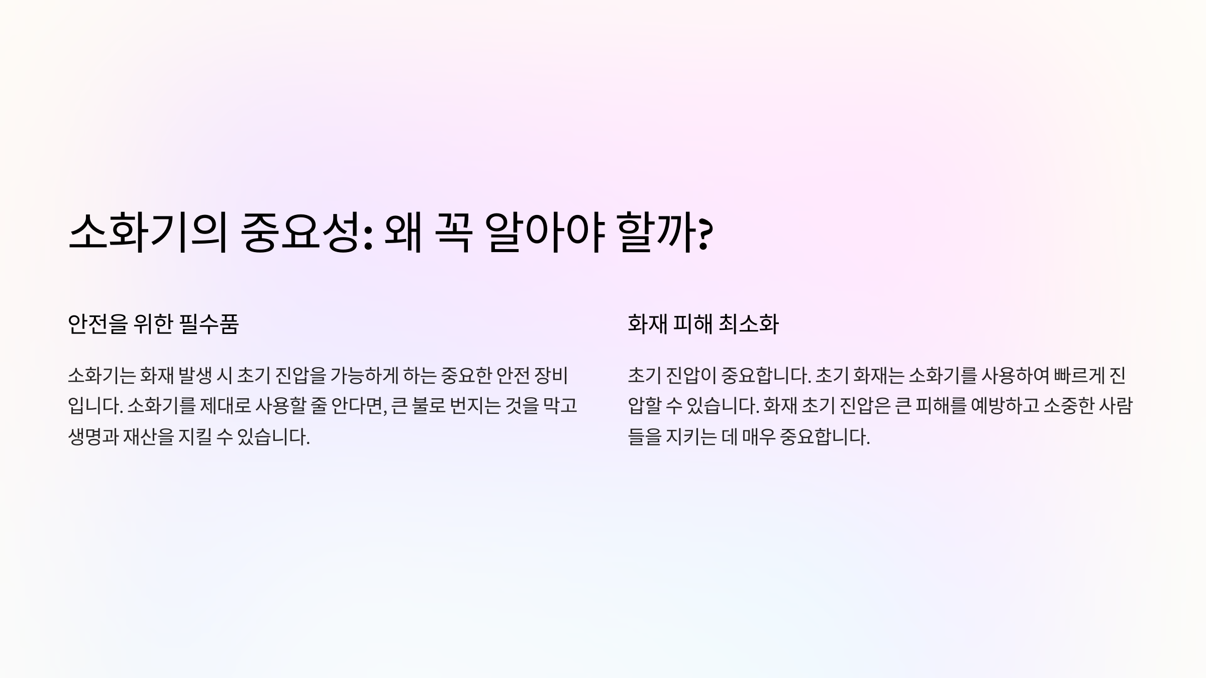 소화기는 초기 화재 진압에 강력한 도구지만, 가장 중요한 것은 항상 안전한 대피와 침착한 대응이라는 점을 기억하세요.
