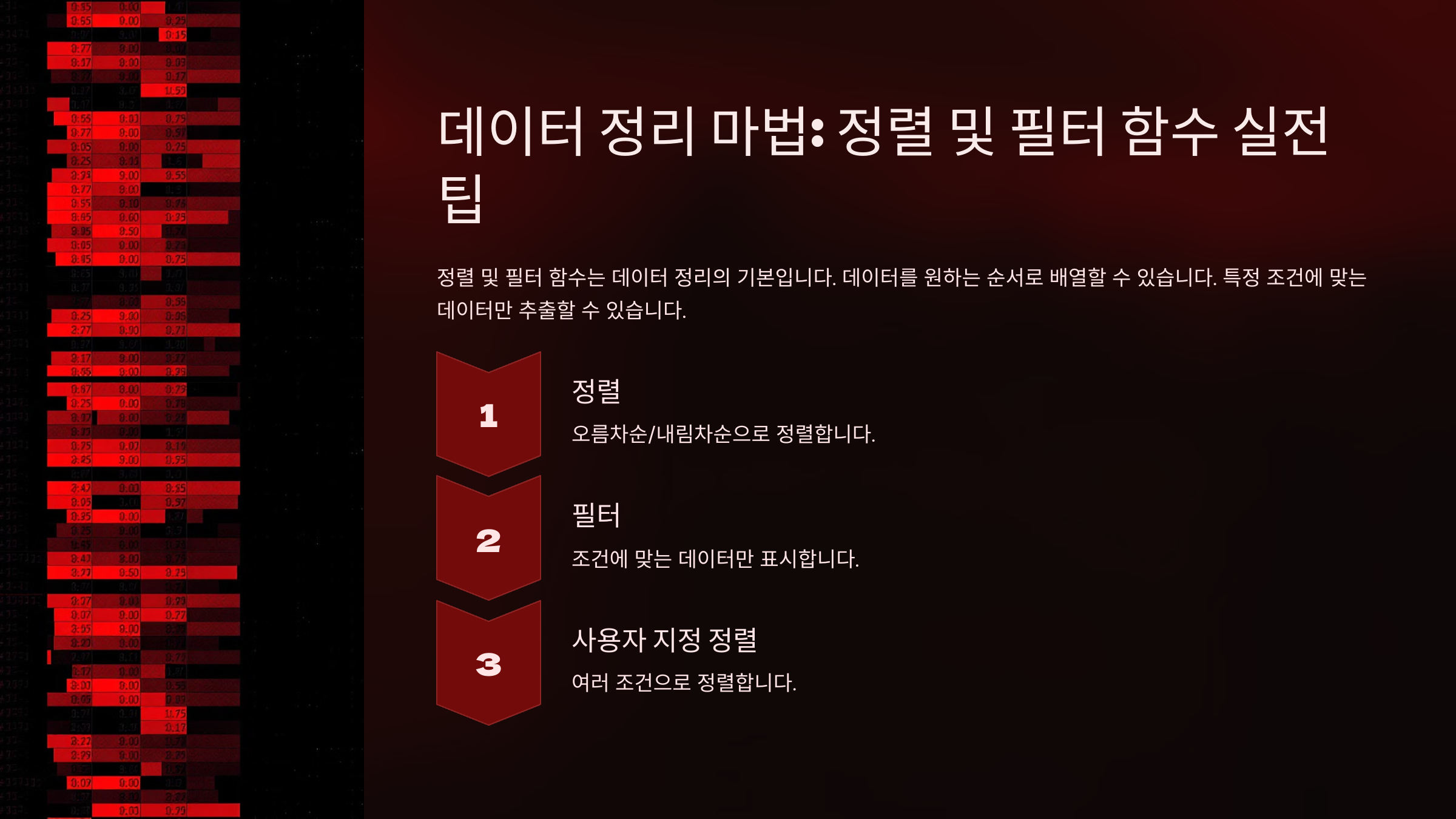 엑셀에서는 데이터를 오름차순, 내림차순으로 정렬하거나 특정 기준을 적용해 정리할 수 있어요. SORT 함수와 필터 기능을 활용하면 데이터 정리가 한결 쉬워져요! ✨