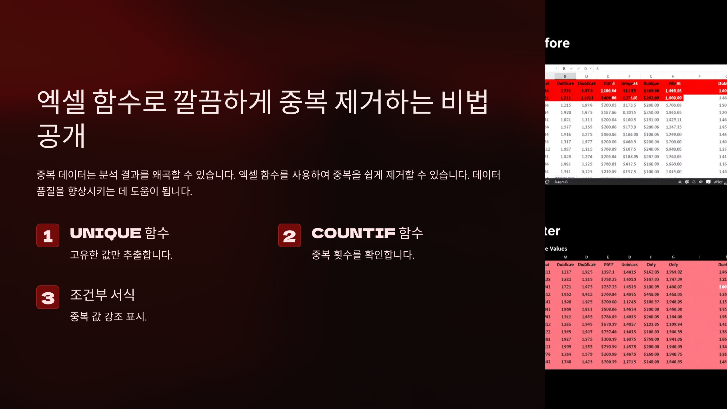 - ✔ 엑셀 함수 활용 – UNIQUE, COUNTIF, FILTER 함수를 사용하여 중복 제거