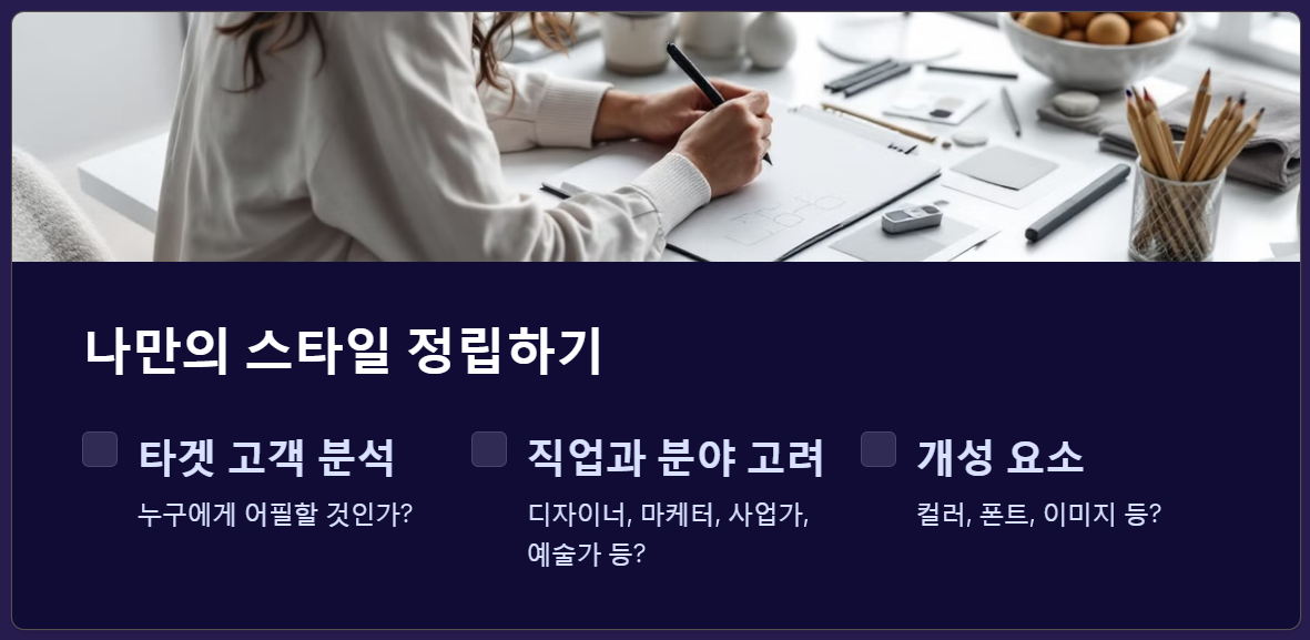유명 브랜드 명함 디자인에서 영감을 얻었지만, 단순히 따라 하는 것만으로는 독창적인 명함을 만들 수 없습니다. 자신만의 스타일을 정립하고, 이를 명함 디자인에 반영하는 것이 중요합니다. 나만의 스타일을 정립하기 위해서는 다음과 같은 질문을 스스로에게 던져보세요.