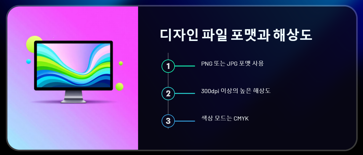 디자인 파일의 해상도는 300DPI(인치당 도트 수) 이상이어야 인쇄 시 선명한 결과를 얻을 수 있어요. 낮은 해상도의 이미지는 인쇄 후 흐릿하거나 픽셀이 깨질 수 있으니 주의하세요.