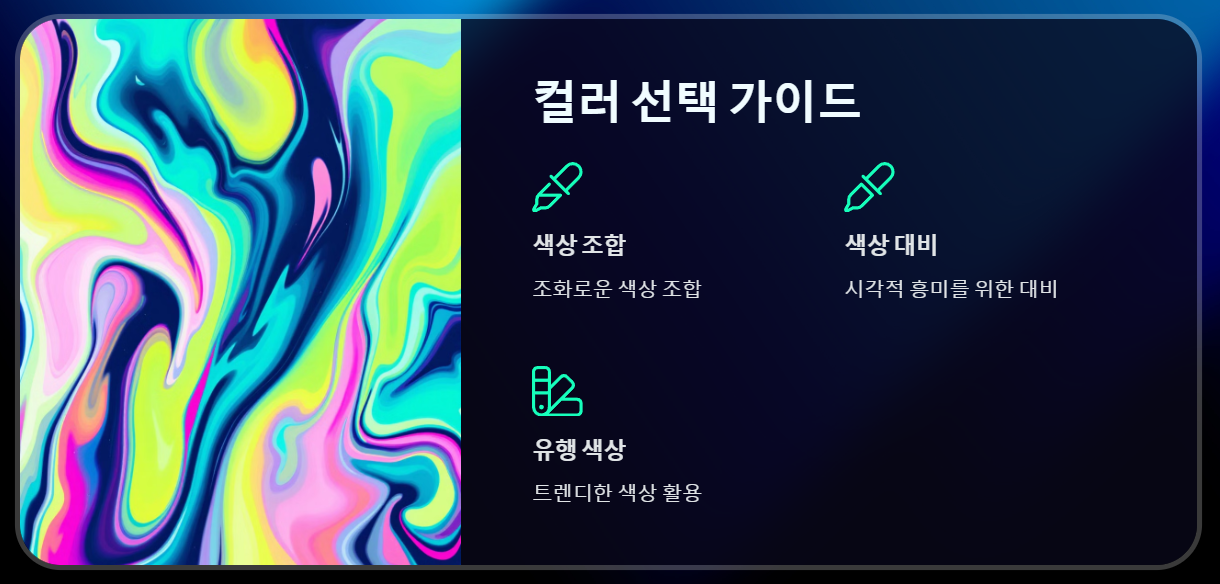 색상의 조합은 조화와 대비를 적절히 고려해야 해요. 주된 색상(primary color)을 중심으로 보조 색상(accent color)과 배경 색상(background color)을 조화롭게 배치하면 깔끔하고 세련된 디자인을 만들 수 있어요.