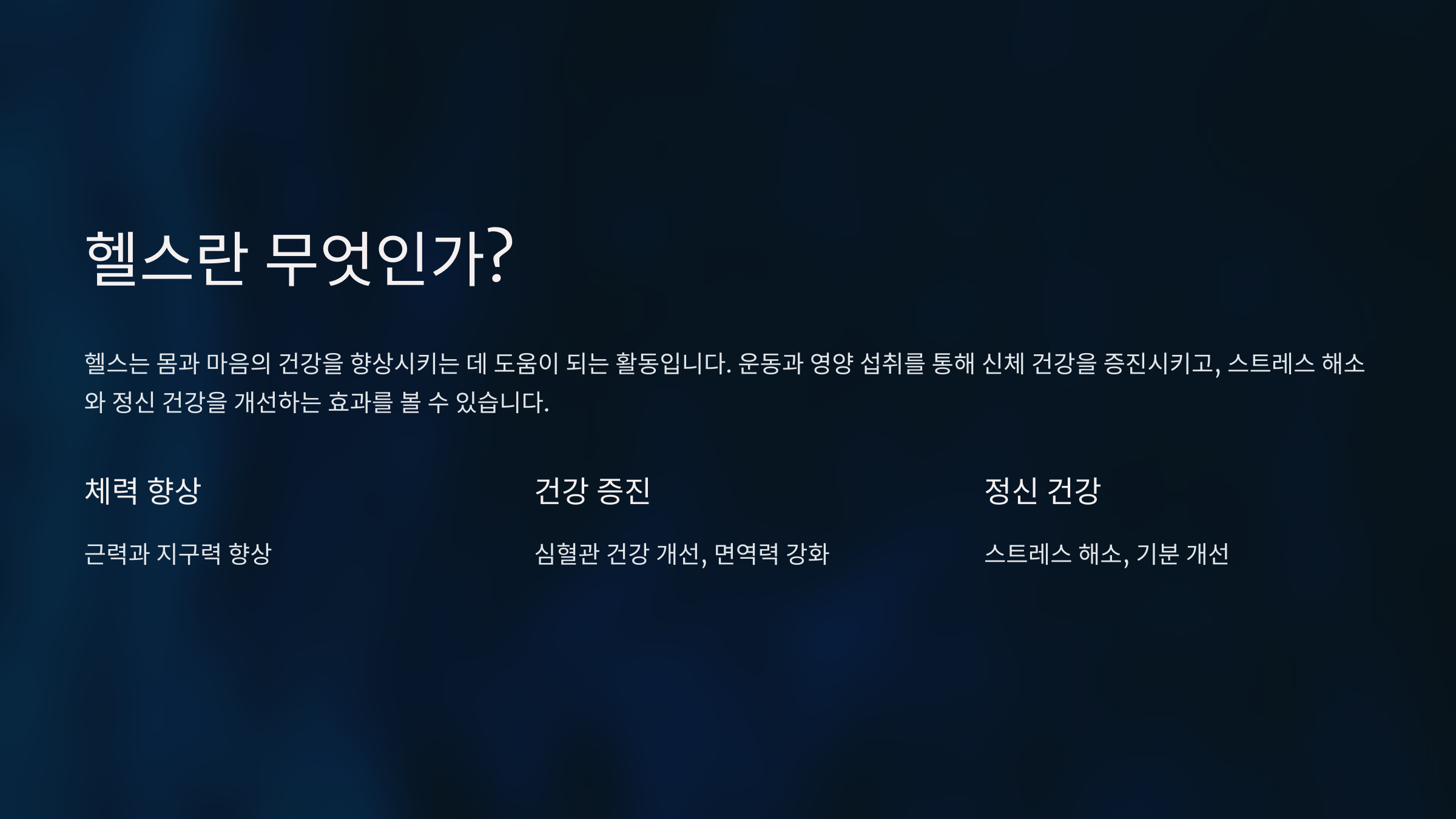 이처럼 헬스는 단순한 체력 단련을 넘어 건강한 삶을 유지하는 데 중요한 역할을 해요. 운동을 꾸준히 하면 신체적으로도, 정신적으로도 더 나은 삶을 살 수 있답니다.
