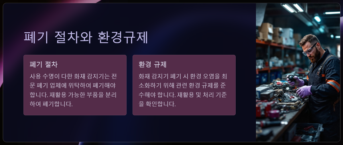 A4. 네, 화재감지기는 일반 폐기물이 아니기 때문에 지정된 폐기물 처리업체를 통해 처리해야 해요. 특히, 배터리나 전자 부품은 환경 규제를 준수해 폐기해야 해요.