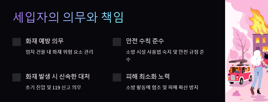 셋째, 세입자에게 화재 대비 방법을 안내할 책임이 있어요. 대피 경로와 소화기 사용법을 교육하고 비상시 연락망을 공유하는 것이 바람직해요.