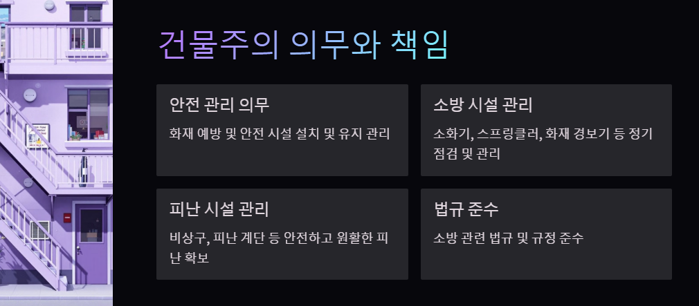 건물주는 화재 발생을 예방하고 피해를 줄일 의무를 지녀요. 첫째, 소방시설 설치 및 유지 관리가 필요해요. 소화기, 스프링클러, 화재감지기 등을 법적 기준에 따라 구비하고 주기적으로 점검해야 해요.