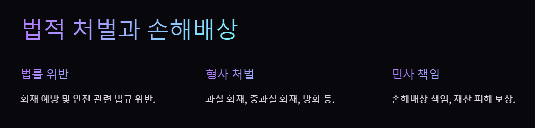 화재 발생 시 법적 책임은 민사와 형사로 나뉘어요. 민사 책임은 손해배상을 의미하고, 형사 책임은 과실치사 또는 중과실 화재 등의 처벌을 말해요.