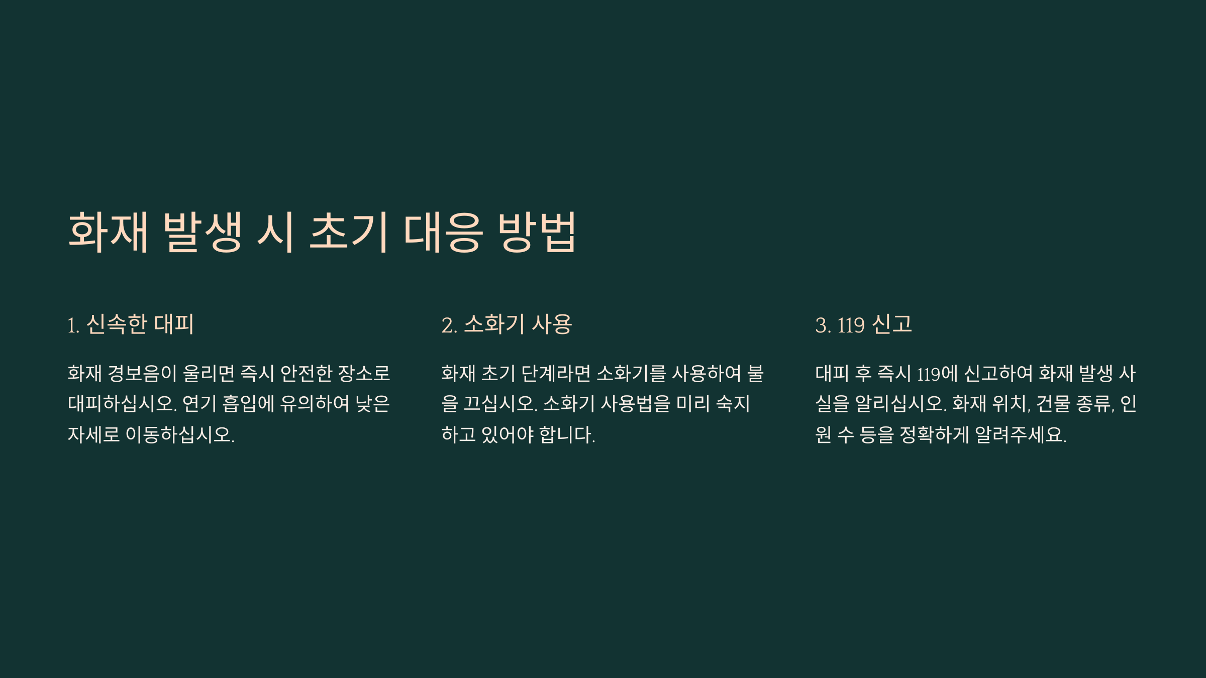 태그: 화재 예방, 화재 대피, 응급처치, 화상 치료, 연기 흡입, 비상 대처법, 안전 수칙, 화재 신고, 비상 키트, 대피 요령