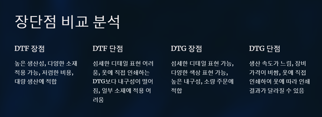 DTF와 DTG 인쇄는 각각 고유한 장점과 단점을 가지고 있어요. 어떤 방식이 더 적합한지 판단하려면 아래 비교 분석을 참고해 보세요.