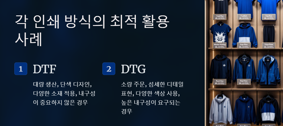 DTF와 DTG 인쇄는 활용 목적과 상황에 따라 선택해야 해요. 각 방식에 적합한 활용 사례를 알아볼게요.